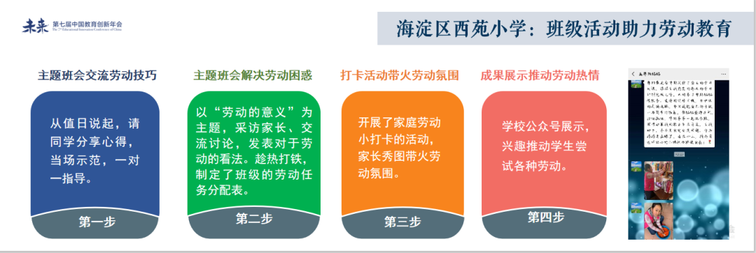 寄宿制学校,学生在家的日子相对较少;目前的劳动教育主要依赖学校,但我们依旧不能忽视家庭教育中劳动的重要性。我们在家长会、家长讲堂中强调劳动的意义,转变家长意识,让学校教育和家庭教育保持一致性。如何强调呢?用数据说话。比如,我们会引用网上流传的一段话:哈佛大学的学者历经一项长达20年的研究显示,“爱做家务和不爱做家务的孩子”20年后的就业率为15:1,犯罪率前者和后者的比例是1:10。大多数家长看到这个结论后都会非常重视学生的家务劳动。这就让能让我们后续的工作事半功倍。我们鼓励班主任老师设计一些要求学生在家里完成的劳动活动。如学校初中部的庞春泉老师,他的班级取名为“四方斋”,开展了“一屋不扫何以扫天下”、“今天的餐桌我做主”、“我和家人包饺子”、“我是小小设计师”等系列劳动活动。