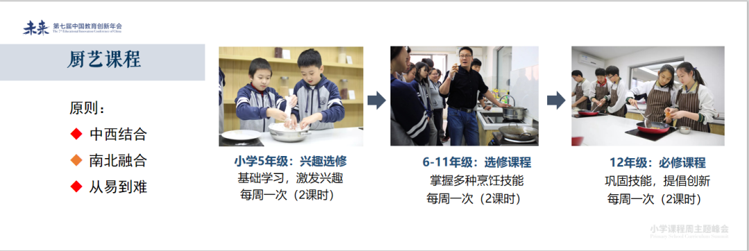 厨艺课程遵循中西结合、南北融合、从易到难的原则,安排课程内容。从5年级到12年级均是每周一次,2课时。小学5年级重在激发兴趣。6-11年级重在掌握烹饪技能;12年级为必修课,重在巩固技能,提倡创新。学校开展“厨艺课程展示汇报”,让所有选课学生烹制菜肴,在午饭时间送给老师和同学;开展“名厨品尝会”,选拔表现优异的同学,烹制菜肴,邀请自己的朋友和老师前来品鉴;参加技术艺术课程“点赞”活动,展示中华饮食文化魅力。荣誉晚宴也深受学生喜欢。奖励宿舍表现好的同学参加正式的荣誉晚宴一次。所有菜品由厨艺老师和厨艺课学生亲手制作完成。